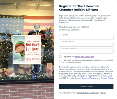 This season, help us spread cheer, drive shoppers into local stores, and showcase our community with the Lakewood Chamber’s Holiday Elf Hunt, an interactive online game that guides players through local businesses. Designed for shops, restaurants, and service providers with a physical location, the Elf Hunt invites businesses to hide a Chamber Candy Cane Crew stuffed elf along with a QR code sign that shoppers scan when they find it. Each scan earns a raffle entry, and uploading a selfie with the elf adds a bonus chance to win. Businesses also receive a window decal to highlight participation. Everything runs through the online map—just hide the elf and QR together and display the provided materials. It’s completely turnkey with no extra work for staff. One special sponsorship level is available for businesses or organizations that want to help spread holiday cheer, even without hosting an elf.